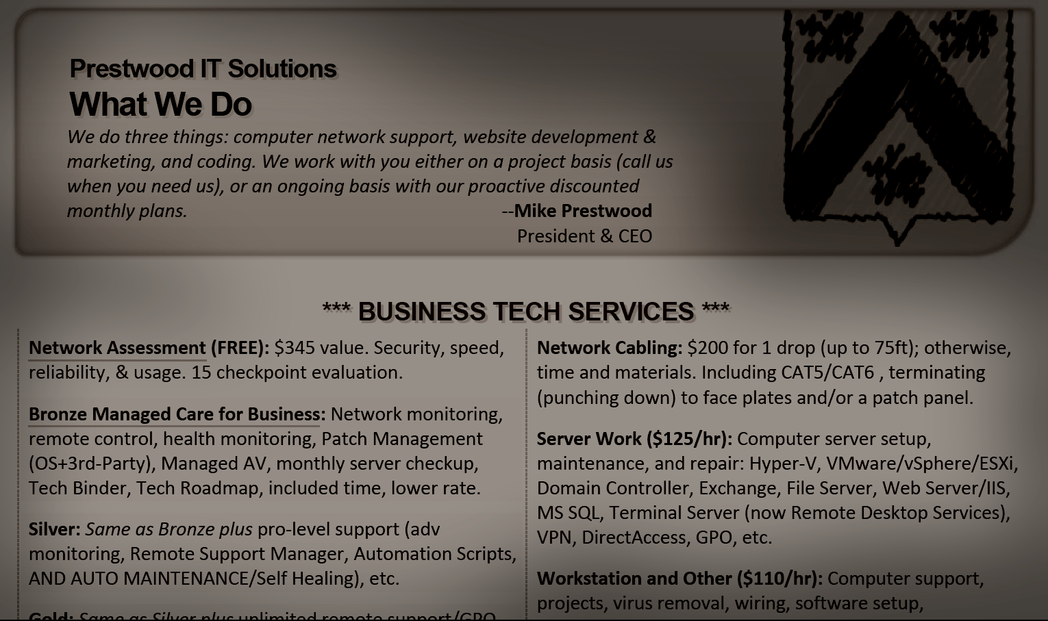 We do three things: computer network support, website development & marketing, and coding. We work with you either on a project basis (call us when you need us), or an ongoing basis with our proactive discounted monthly plans.